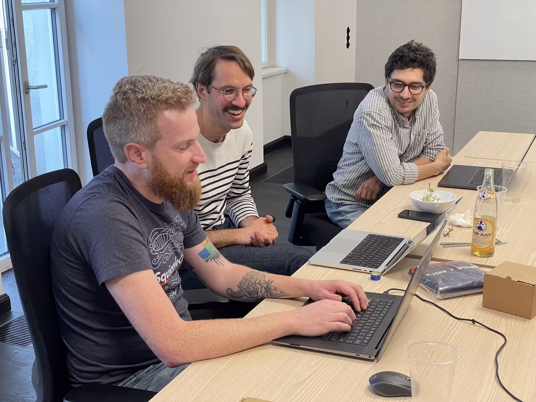 ReScript contributors working together during the retreatReScript contributors discussing implementation details at a tableReScript contributors collaborating in the retreat office